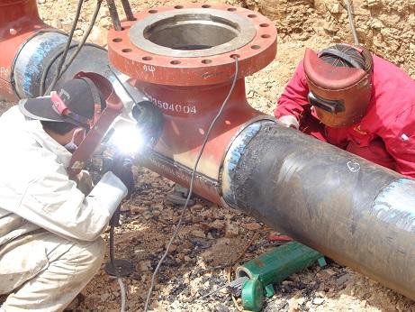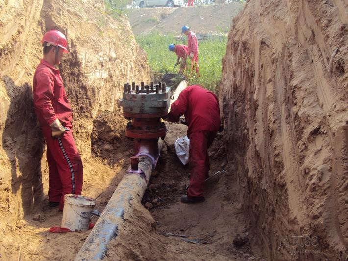 PE 管开孔封堵技术是对正在运行中的管网、 管线进行不停输施工作业的一项作业方法,主要是通过聚乙烯管专用开孔设备来完成。它的基本原理是:在带压输送运行中的管线上某一要进行各种施工或抢修作业 的管段两端进行双封双堵,使用开孔 封堵设备截断该管段介质的流通 ,利用架设在管段 两端的开孔封堵 设备上 的临时旁通连接被施工作 业管线的两端 ,让管线内的介质通过临时旁路继续 不停的输送 ,使整个管线在施工作业过程中仍然保 持正常输送运行。根据施工作业的目的和采用管线 结构形式的不同,在带压运行管线上更换阀门、更 换管段或管道改线、在管道上嵌三通镶接 以及处理 管线其他故障时,就要进行双封双堵形式的开孔。 此时开孔的目的是为 了封堵,即将两 台同一规格型 号的开孔机安装在施工管段的两端 ,与事先电熔焊 接在管线上的专用聚 乙烯管件连接 ,开孔刀伸入PE 管件 内将其母管各开 出一个孔 ,孔的大小由采用的 封堵头的规格而定。开孔完成后,由封堵器执行封 堵。封堵器将封堵头下降置入 已开好的孔 中,操纵 封堵器使折叠皮碗或 “三明治”蝶阀堵头打开,封 堵头在管段两端的内孔中背靠背地将介质截断。